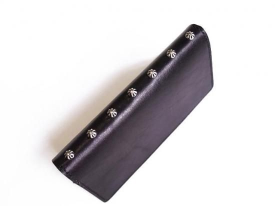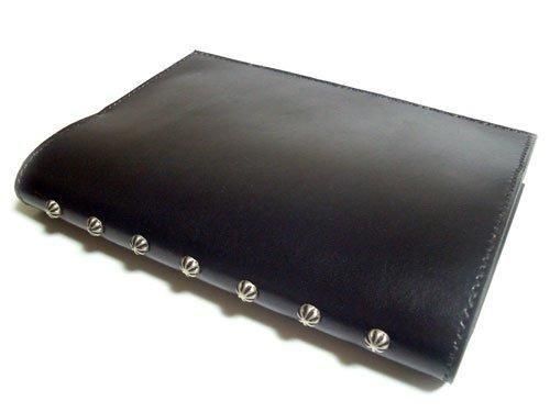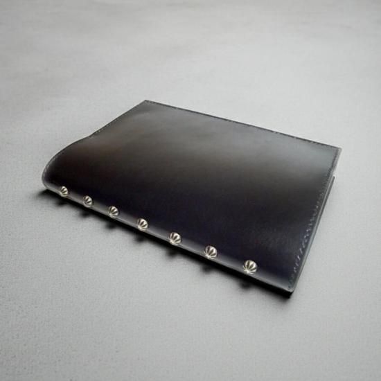 背表紙にアンティークニッケルのスタッズを使用して作り上げたシンプルでストイックなデザイン