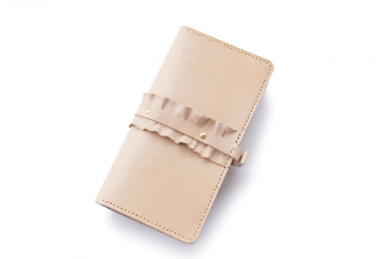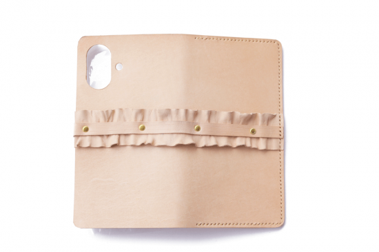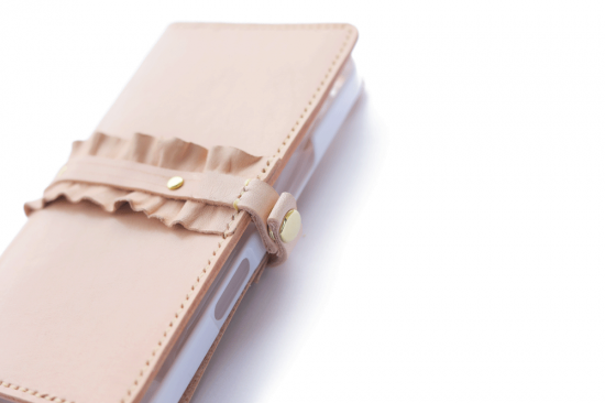 上質なヌメ革に革フリルが付いた、ロマンチックで可愛らしい手帳型iPhoneケースです。