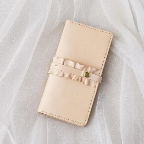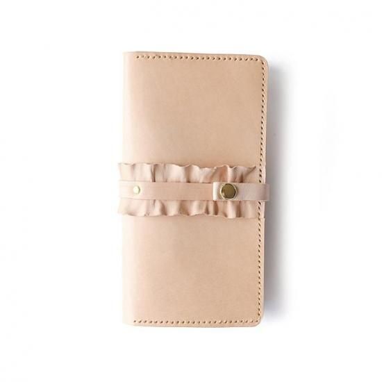 上質なヌメ革に革フリルが付いた、ロマンチックで可愛らしい手帳型iPhoneケースです。
