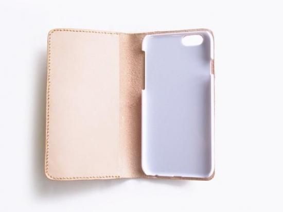 ヌメ革に革フリル付きフロントホック留めiPhoneケース。